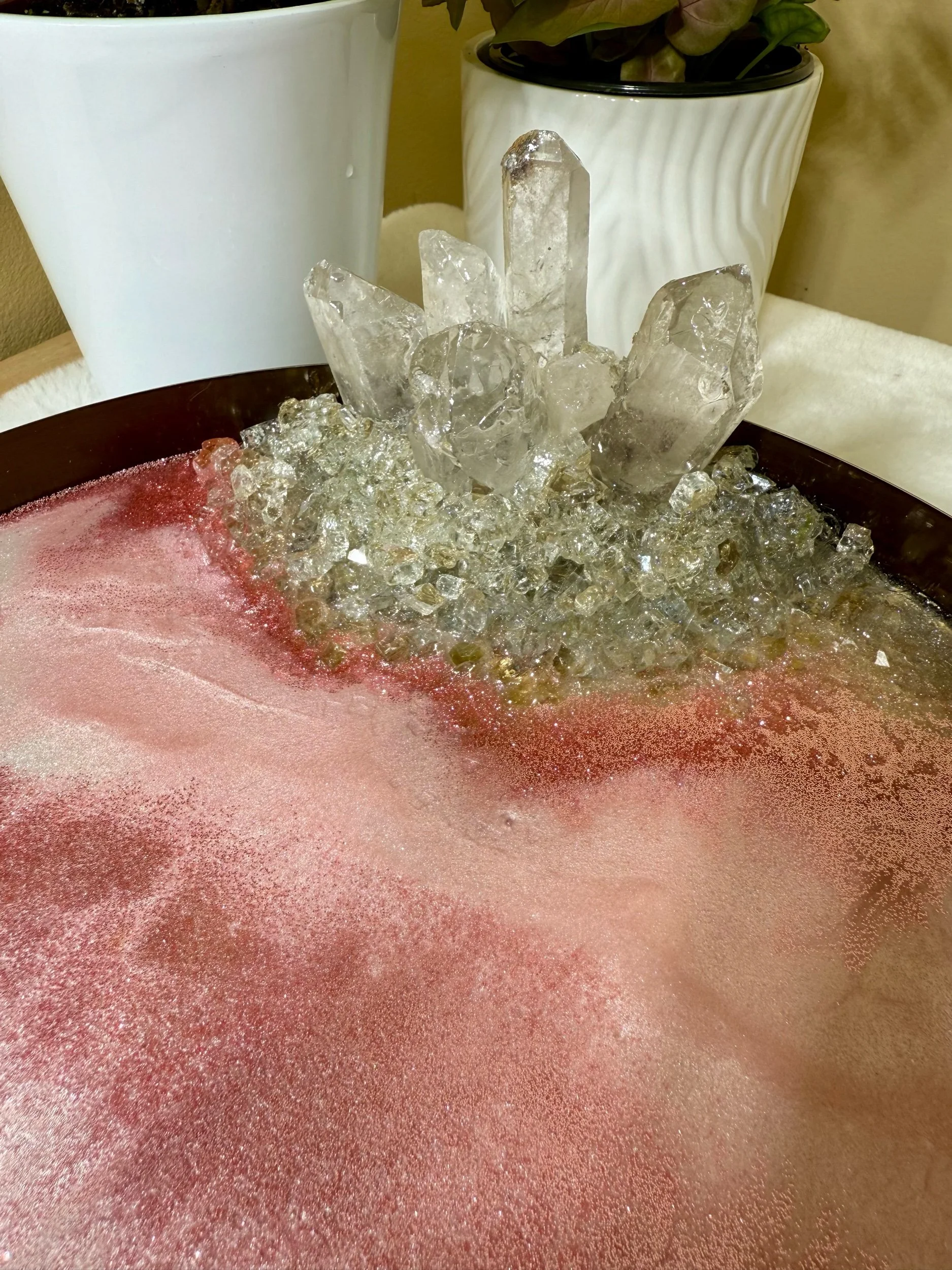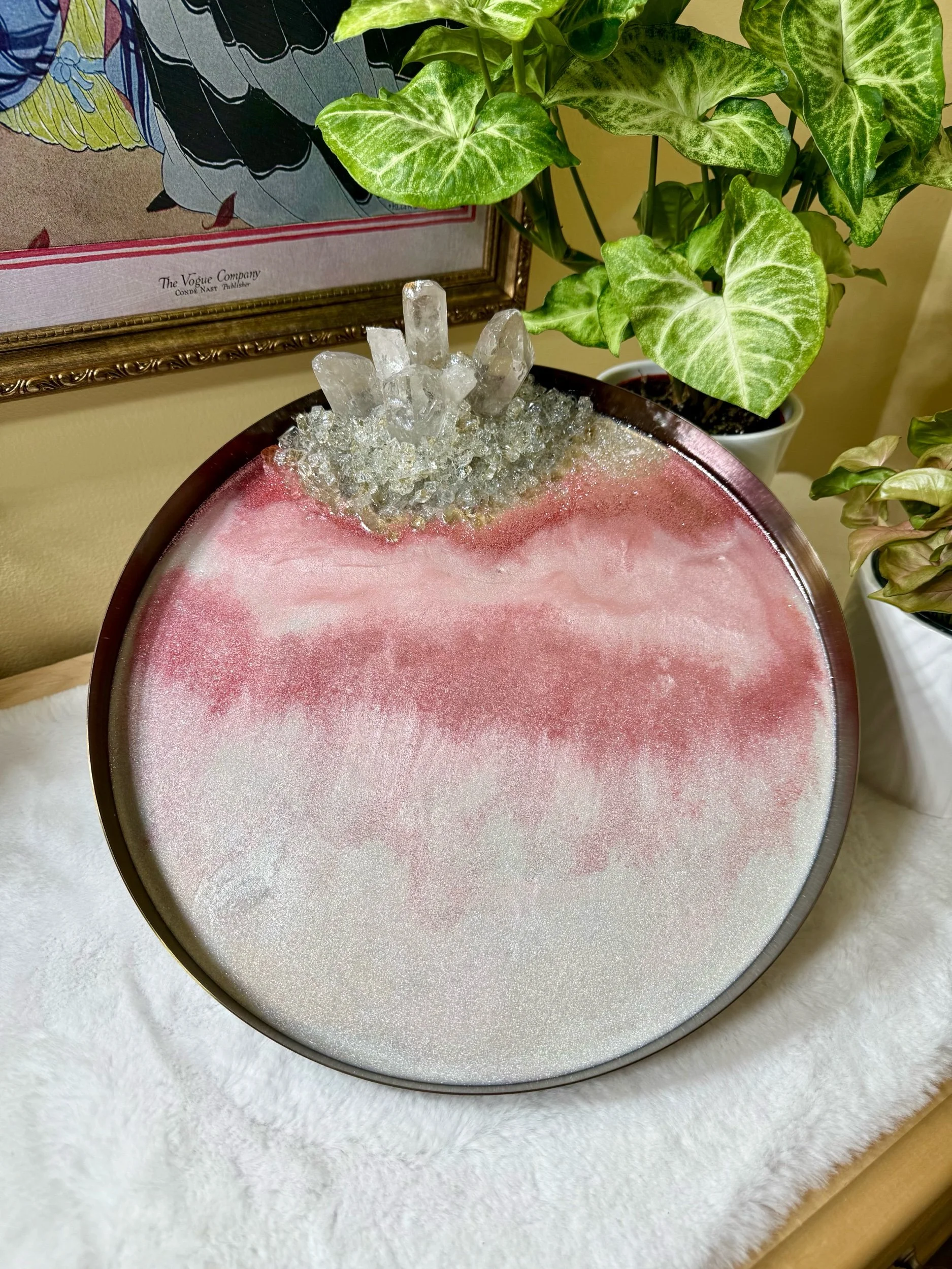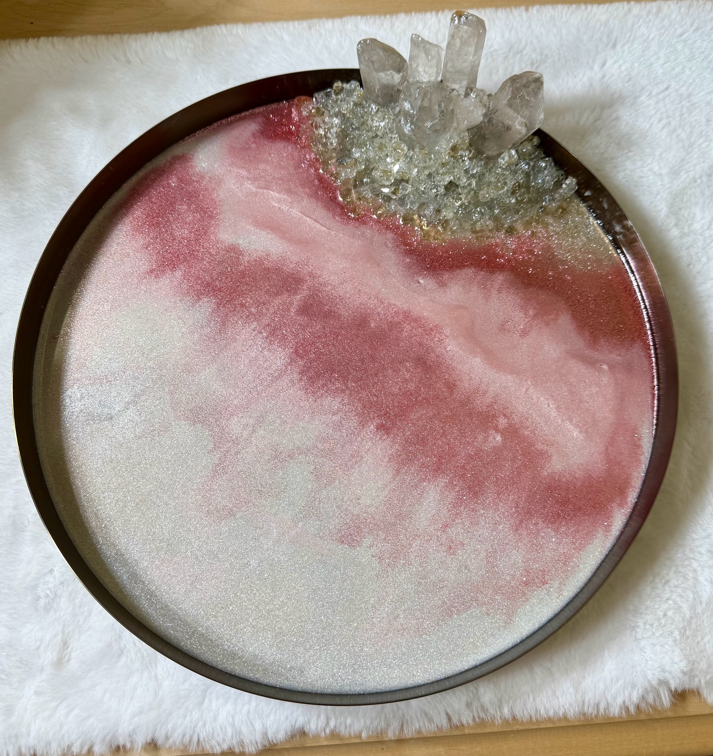 Image 1 of 4 Image 2 of 4 Image 3 of 4 Image 4 of 4 Serving Tray / Catch all / Jewelry Tray $90.00 Crystal and rustic gold metal tray with resin pink and clear quartz crystals, glass and glitter glass 12 inch round Quantity: Purchase Added! Crystal and rustic gold metal tray with resin pink and clear quartz crystals, glass and glitter glass 12 inch round