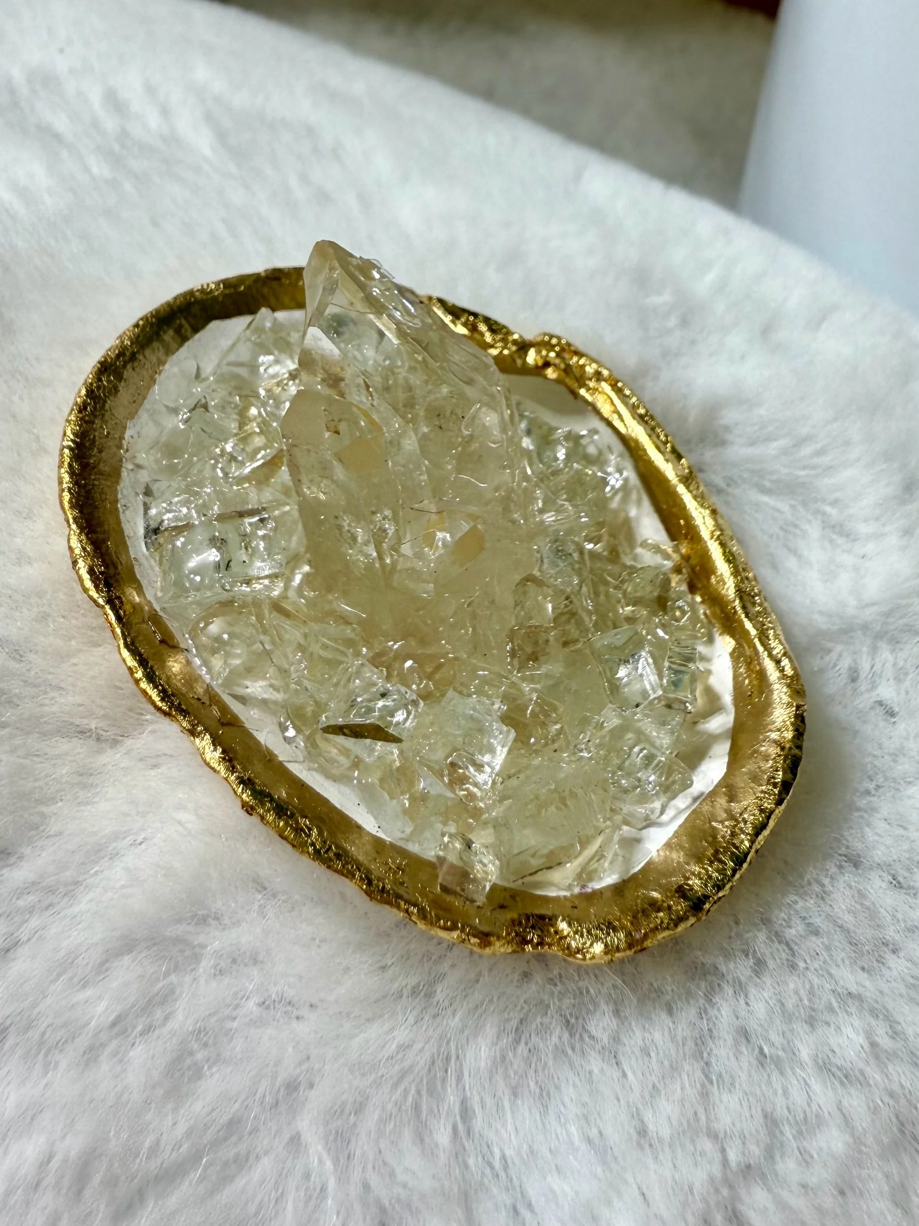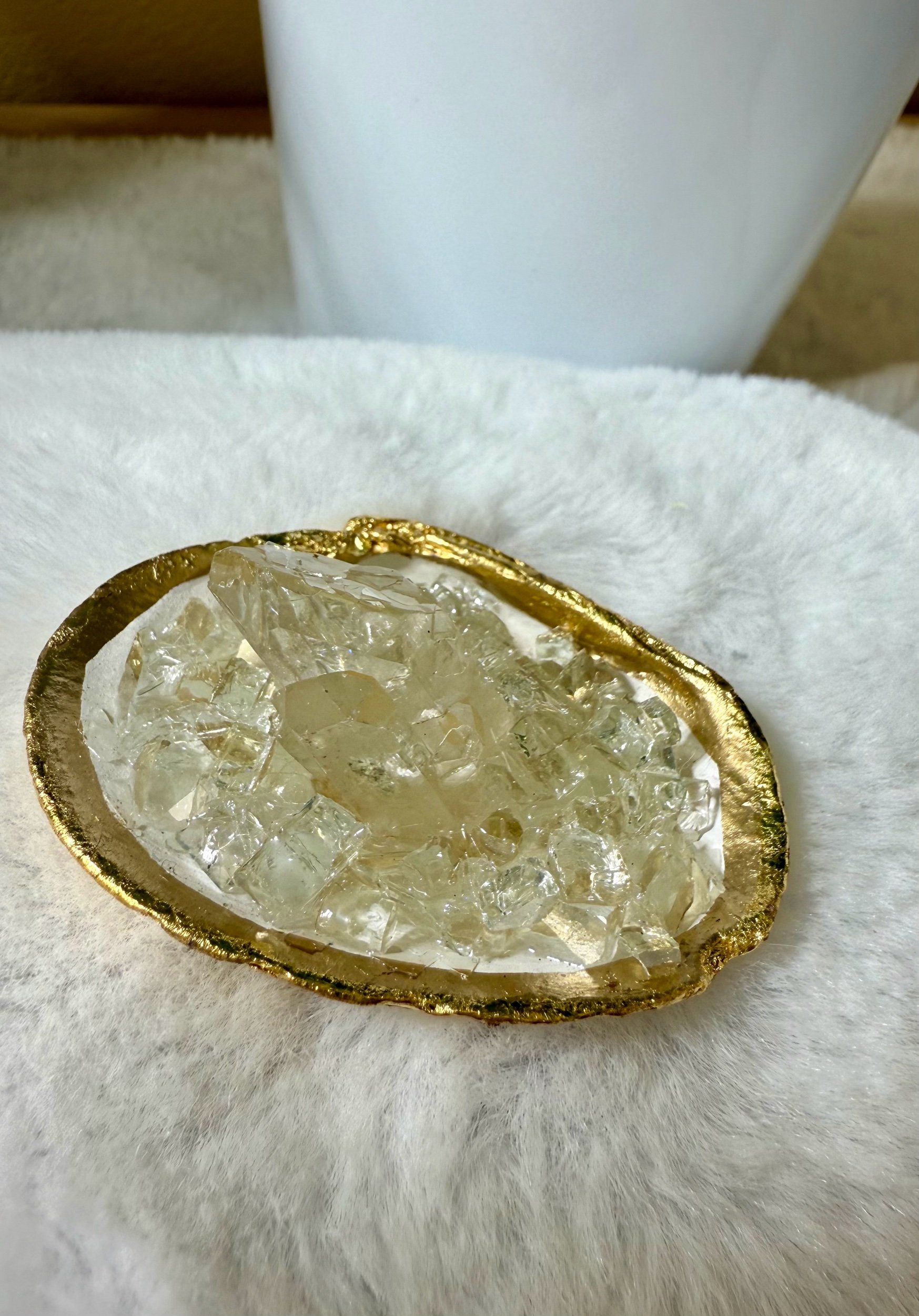 These seashells are cleaned painted and embellished with gold/silver leafing, glass, clear quartz crystals and German cut glitter glass they work beautifully for gifts and some for putting your rings on. Many people buy them as alter pieces.