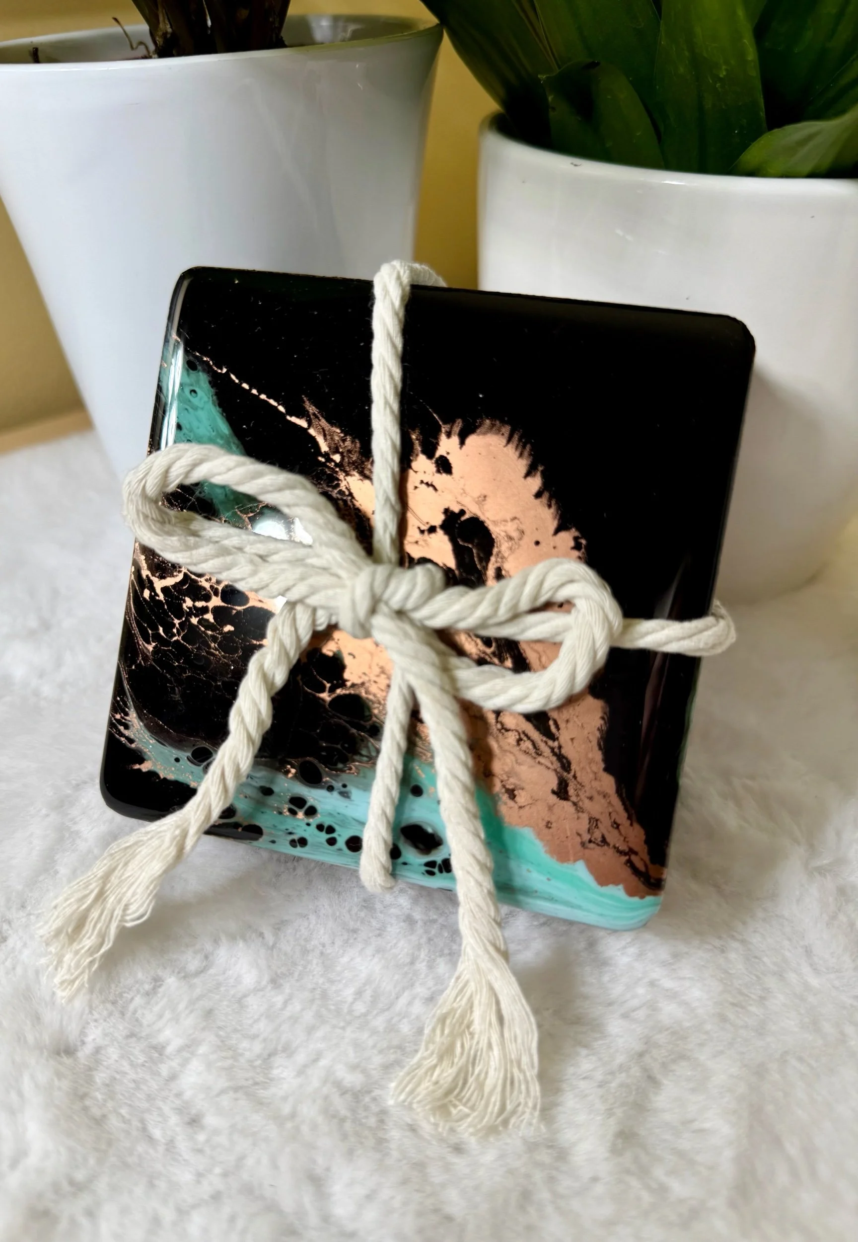 Image 1 of 4 Image 2 of 4 Image 3 of 4 Image 4 of 4 Coasters set of 4 Black Blues and Copper $55.00 Coasters set of 4 Black Blues and Copper 4 inch square. These are painted in resin on stained pine wood with cork backs Quantity: Purchase Added! Coasters set of 4 Black Blues and Copper 4 inch square. These are painted in resin on stained pine wood with cork backs