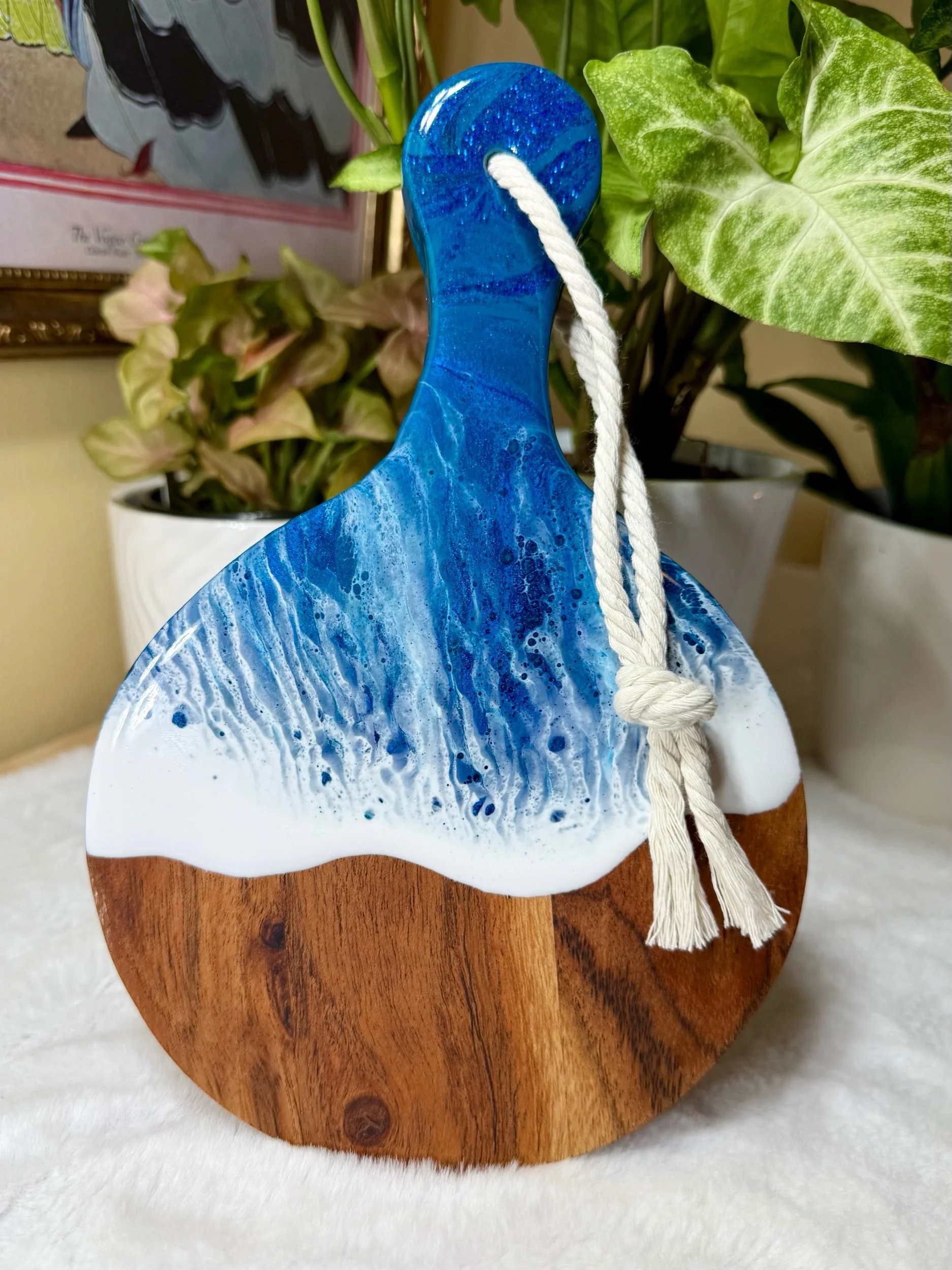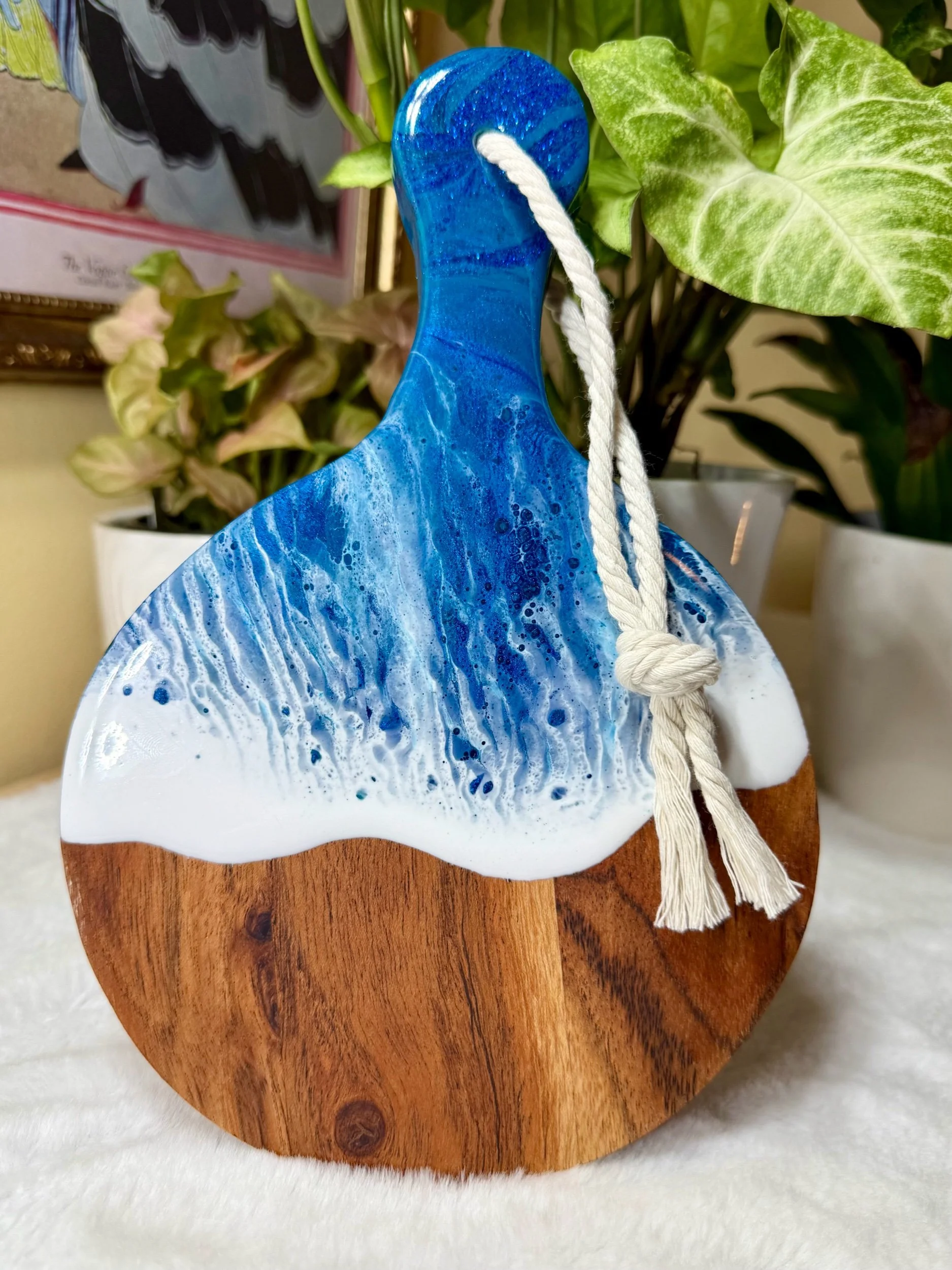This little round paddle board is made of Acacia wood, which is a hardwood that is tropical and is great for charcuterie. I have lovingly painted this board with an ocean theme I call oceans embrace.