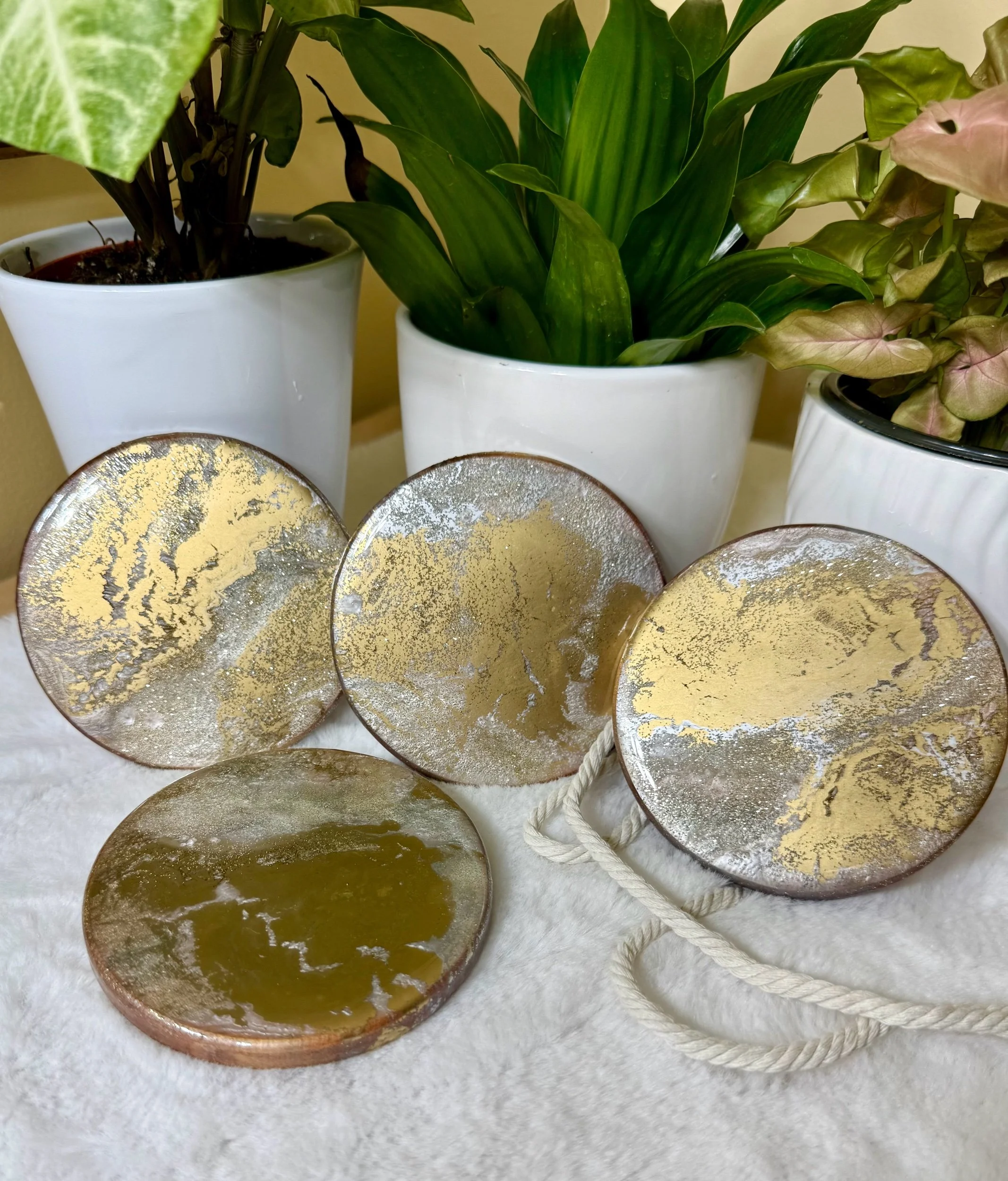 Image 1 of 4 Image 2 of 4 Image 3 of 4 Image 4 of 4 Coasters Round Gold and Riches $55.00 Coasters resin gold silver white diamond glitters set of 4 round Quantity: Purchase Added! Coasters resin gold silver white diamond glitters set of 4 round