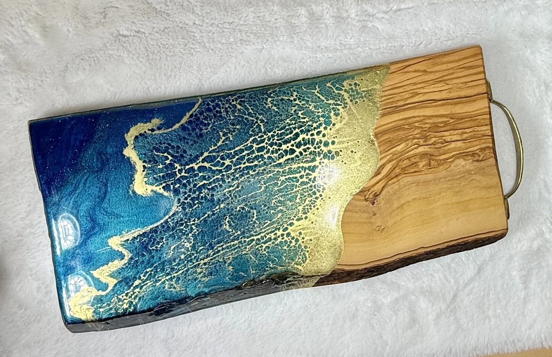 This charcuterie board is made of live edge olive wood, which contains natural germ fighting properties and is a heavy solid board. It has a sweet lil gold metal handle that is sturdy. I have lovingly painted this board with an ocean theme and gold waves I call oceans embrace.